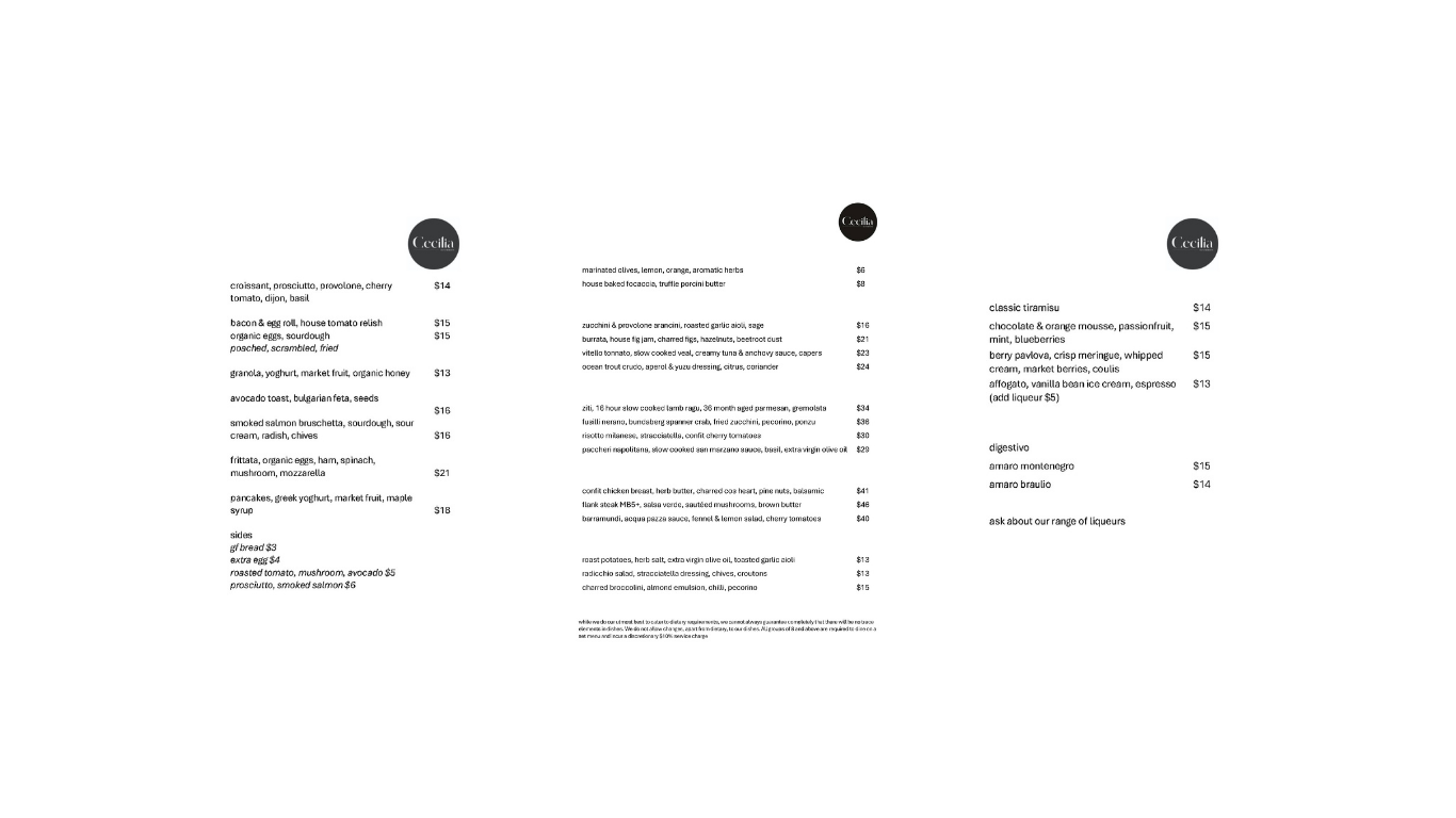 Every dish at Cecilia tells a story all thoughtfully prepared to delight every palate. Our curated wine list features a selection of Italian and Australian wines, carefully chosen to complement every meal.